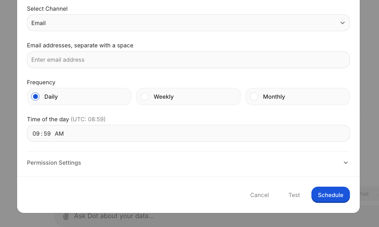 <figure><img src="https://3709841693-files.gitbook.io/~/files/v0/b/gitbook-x-prod.appspot.com/o/spaces%2FCeRlmJf2y704TpjpubE1%2Fuploads%2Fgit-blob-dbb9a2a219e2c538490ebae962bd4def2c34140d%2Fscheduling-dialog.png?alt=media" alt=""><figcaption><p>Configure channel, recipients, and frequency</p></figcaption></figure>